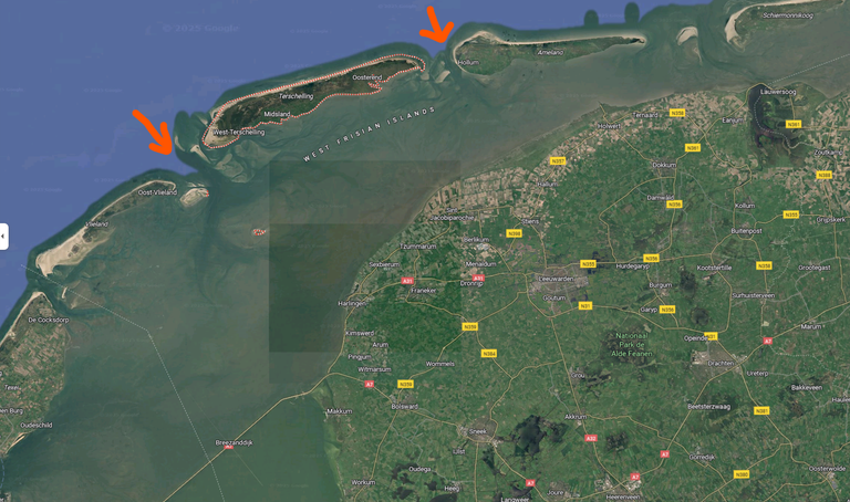 Terschelling looks like a barrier island. These breaks are called tidal inlets, the ones with red arrows.