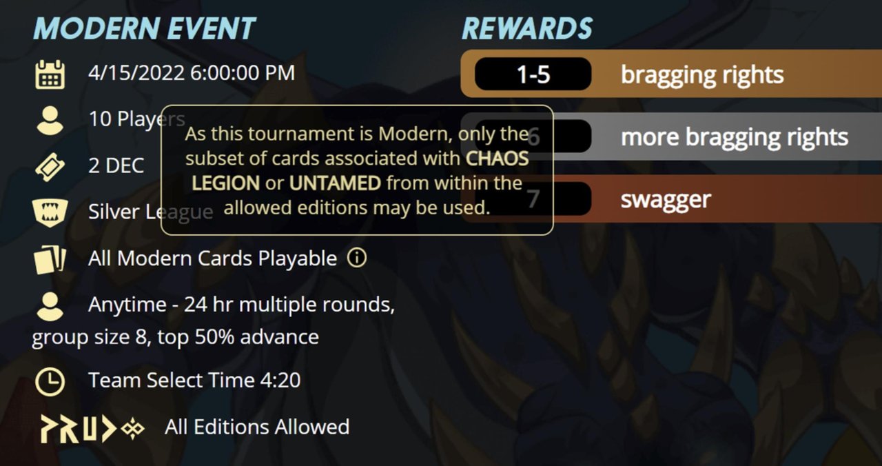 - Los torneos con formato Moderno y salvaje serán incluidos luego del lanzamiento oficial de los mismos.