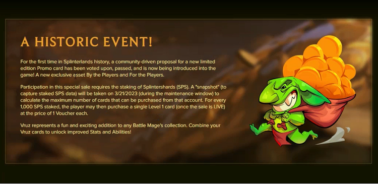 Y es que SPLINTERLANDS es un juego que no deja de sorprendernos, muestra de ello está en el lanzamiento de esta carta promocional, representada en el monstruo común VRUZ del splinter DRAGON, que viene a reforzar la estrategia SNEAK de bajo baja, dado que solo consume 02 puntos. Y por supuesto dentro del campo económico del juego, esta venta promocional viene a realzar los beneficios que tiene el STAKE de SPS.
