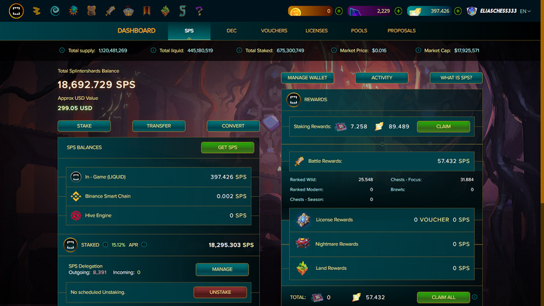 The main benefit of having our SPS frozen is that we generate at the time of writing this post a 15.12% annual profit, and at the same time profits in VOUCHERS tokens; used most of the time in special promotions in the SPLINTERLANDS store. Another benefit whose emergence was accompanied by a modification in SPLINTERLANDS, is that the SPS you have in STAKE determines your rewards when playing, I share my personal case: