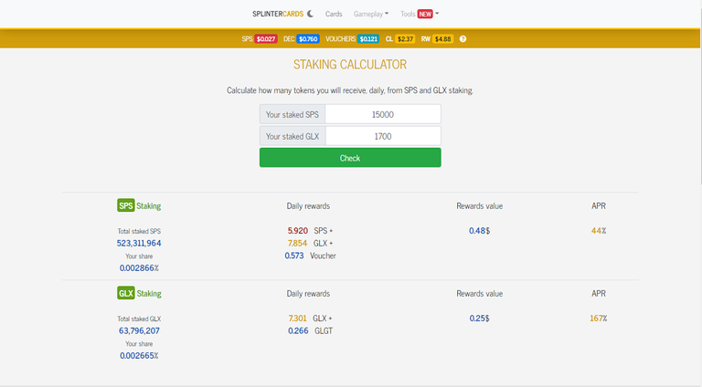 Por su parte el GLX se obtiene por STAKE de SPS, el token de gobernanza de SPLINTERLANDS, y de allí la importante relación entre ambos juegos que comenté al principio de esta publicación. Según esta captura del portal de SPLINTERCARDS, se aprecia también que el propio STAKE de GLX genera más GLX y también GLGT, token hacia el cual está centrada esta publicación.
