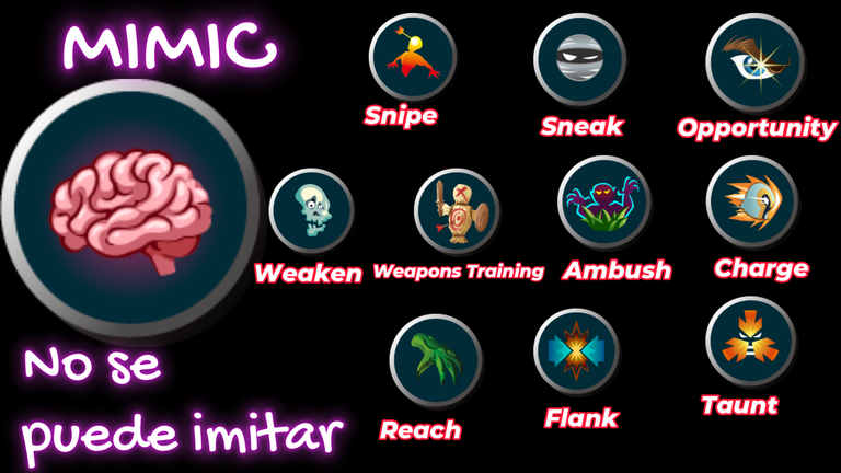 In that sense we start with the MIMIC skill, which will revolutionize the game strategies; because of its power it makes me think that it will be a skill of epic and legendary monsters, since the presence of this skill in the monster makes that from round 02 it can obtain a skill from the enemy team, super interesting, and so the monster possessing MIMIC will be doing it in the following rounds. It is worth noting that the DISPEL that is used to remove positive effects, can eliminate one of these acquired skills, emphasizing that not all skills can be imitated, the following image explains what they are:
