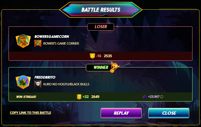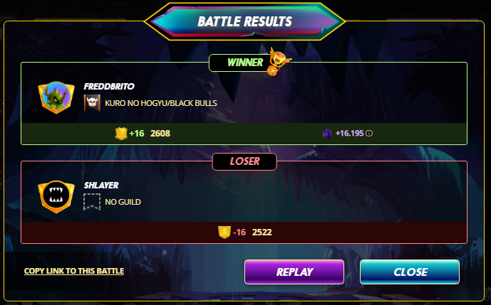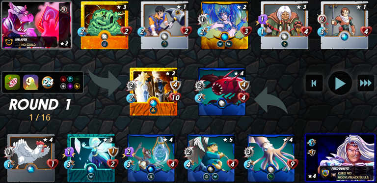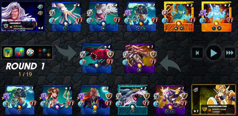 In this first battle, Cruel Sethropod was of great help since by taking the most damage and being the first card eliminated, thanks to its resistance it helped the following cards in my formation to cause even more damage to my opponent's cards and thus be eliminated little by little. In first position and as dictated by the challenge of this week I placed Cruel Sethropod, which thanks to the rule "Equalizer" could get 11 points of life, becoming a tank of life and resistance. In the following positions are: Flying Squid, contributing to the damage from the second position, Deeplurker damaging the enemies that are with less life points and in the next 3 positions I abused a little with the legendary cards LOL, since I placed: Djinn Oshannus, a highly powerful magic attack card, with a lot of life and speed points. He is followed in the formation by Poseidon, another very powerful ranged card and the second Golden Legendary I got and in last but not least position is the ever faithful Spirit Miner, helping my cards to have more speed. In this battle although Cruel Sethropod could eliminate the first card of my opponent, due to the ability of the enemy River Hellondale, he could revive that first card, with which Cruel Sethropod was defeated in the next turn, however, he could resist enough so that my other cards in formation could cause enough damage to be easily eliminated, thus giving me the victory in this battle.