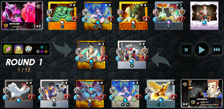 This first battle I thought I was going to lose, because although at the beginning my team was leading the battle and eliminating most of my opponent's cards quickly, in the last turns, the situation turned in favor of my opponent, luckily, I could win obtaining the necessary victory to make this challenge. In first position I placed one of the most classic cards of the LIFE deck: Silvershield Paladin, which is an excellent defensive card, in next position and attacking from the second position is: Luminous Eagle, being this a card that I use a lot when I choose the LIFE deck. The next card in the list is: Celestial Harpy, which is a card that at first I did not use, but I have seen that it is a very useful card, especially when the amount of mana is low. The next card in the formation is Gargoya Scrapper, as this week's challenge dictates, this card really did not do much in this battle, it only attacked in one opportunity and could not eliminate my opponent's card. Continuing with the formation and being the card that helped me the most in this battle not to lose thanks to its ability "Tank Heal", is: Venari Crystalsmith and in last position and being another of the most classic cards of the LIFE deck, is: Feral Spirit.