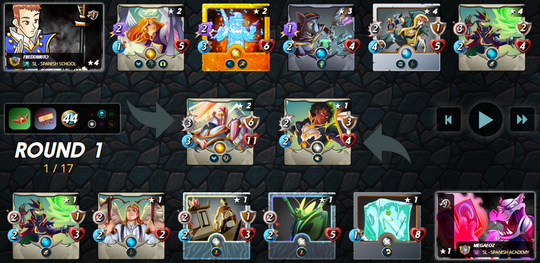 In this first battle I used my favorite deck: Death, so in the first position I placed one of my favorite cards of this deck: Haunted Spirit, a pretty good offensive and defensive card. In the next two positions I placed two 0 mana cost cards and those cards are: Corpse Fiend and Furious Chicken, two very useful cards to dampen certain enemy attacks. In fourth position I placed a card that is one of the most classic of all Splinterlands: Creeping Ooze. Continuing in the formation and as this week's challenge dictates, I placed: Venari Spellsmith and in last position one of my favorite cards of this deck and another of the most classic: Twisted Jester.