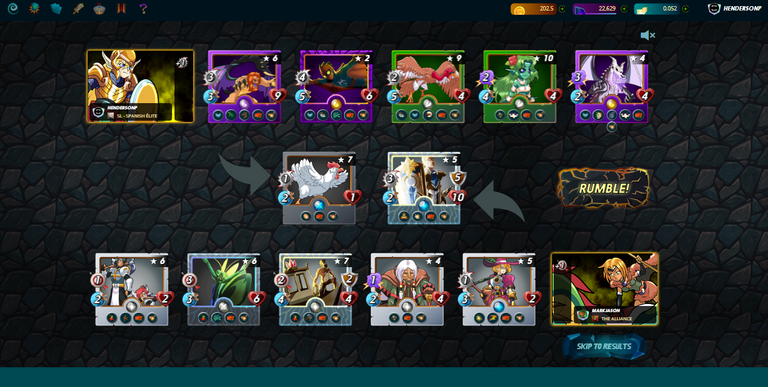 FURIOUS CHICKEN : En primera posición como ya lo he comentado siempre que se sobre un espacio para agregar un monstruo el FURIOUS CHICKEN es super útil, en este caso lo coloque en primera posición para qué recibiera el posible golpe más fuerte del equipo contrario, como estaba activa la habilidad de blast la idea fue que mis monstruos con habilidad de Opportunity realizaran el mayor daño posible. || In first position, as I have already mentioned, whenever I know about a space to add a monster, the FURIOUS CHICKEN is super useful, in this case I placed it in first position so that it would receive the strongest possible blow from the opposing team, as the ability was active de blast the idea was that my monsters with Opportunity ability do the most damage possible.The characteristics of this battle were the following, Heavy Hitters that causes all monsters to cause double damage if the monster being attacked is stunned, the second rule was Explosive Weaponry that makes all monsters have Blast in their attacks and finally the The maximum amount of mana for this battle was 28, below I share my strategy for the battle.