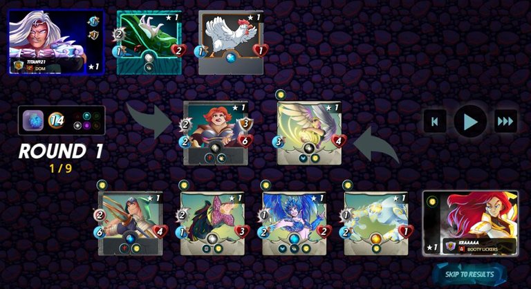 I did not expect the enemy to choose YODIN; YODIN is one of the best summoners, but he is a poor choice in this particular match. Because the opponent did not select monsters with the FLYING ability or monsters that can increase his monsters' armor, which is why every time the round ends, his monsters take damage from the EARTHQUAKE ruleset, giving me a damage output advantage and winning the game.