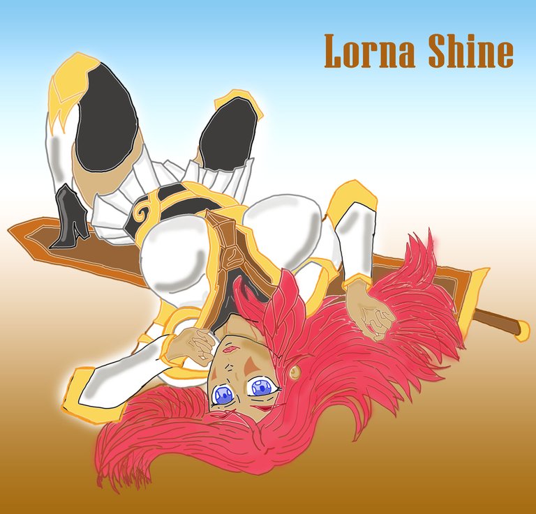 The White Plains of Khymeria boast an extremely mild climate that allows for some Khymians to live in the elements throughout the year. Lorna Shine is one such Khymian. She wanders throughout the valley, visiting acquaintances and attending celebrations. Her skin is incredibly fair, no matter how much time she spends outdoors, and her red hair shines like a flame as she approaches from a distance at sunset. Lorna carries a huge sword on her back. When the sword is removed from its sheath for combat, it always does magnificent work.