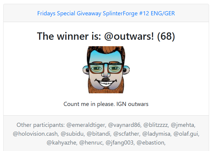 - Kommentiere den Beitrag, um teil zu nehmen. Wenn Ihr #SplinterForge Benutzername nicht derselbe ist wie hier, geben Sie ihn in den Kommentar an.