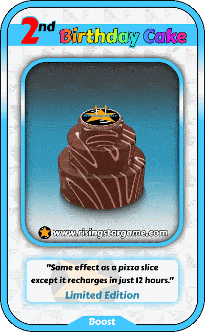 | É a comemoração dos 2 anos de aniversário de Rising Star e nada melhor do que comemorar esse grande evento com um bolo bem delicioso, não é mesmo? Então em clima de festa podemos obter uma carta exclusiva desse marco. |