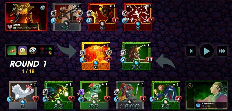 In the second battle, I had a chance to use powerful cards, thanks to a lot of mana, so I built an attack of Magnor, Chimney Wallstop, and augmented it with strong archers - Lava Launcher, Ettin Spearman, and Pyromancer, adding Tarsa to their health.