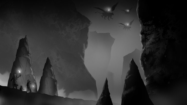 When they all reached this new outcropping further down in the canyon, they left the flying mounts behind as the canyon was too narrow for them to traverse further. It was truly dark this deep. Only their lantern light provided any depth to the space. Their shadows danced along the walls. A few of their company complained about vertigo from being unable to get their bearings in this large space.