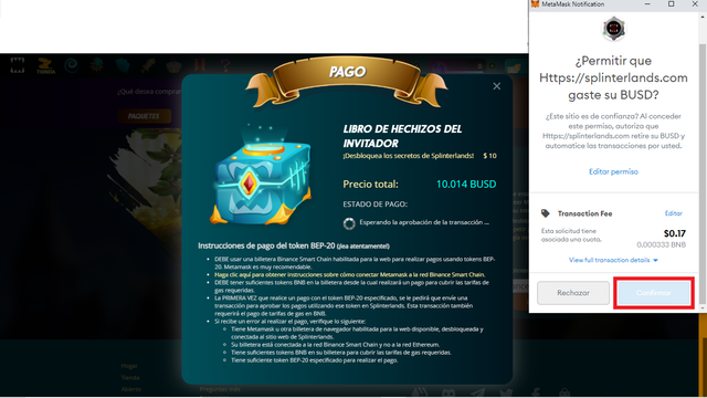 6.- Les aparecerá la típica ventana de confirmación de permiso que tienen que pagar y le dan confirmar, esperan un poco hasta que les aparezca de nuevo otra ventana de hacer la transacción del pago de libro (Spellbook).