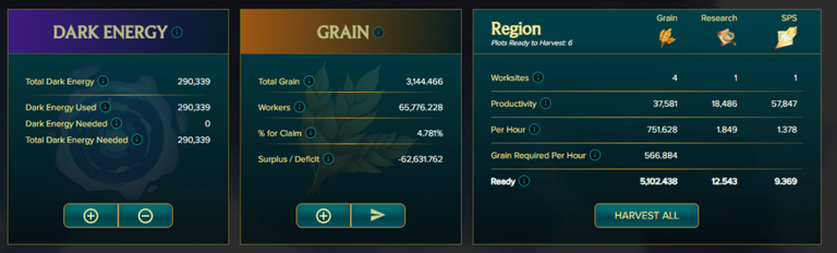 Speaking of Land, a lot of small fixes and quality of life improvements have been coming out to make it easier to manage. I'm at a spot where I've got enough grain production going to supply my one Research and one Splintershards (SPS) plots. I still have 4 under production, three more grain and one more SPS mine, as well as 3 plots I don't currently have monsters or Dark Energy Crystals (DEC) to really support.