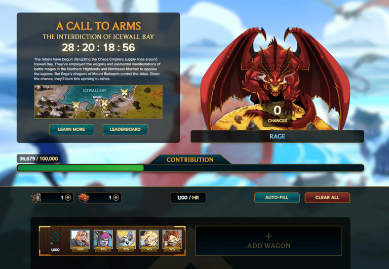 To get points towards a chance at an airdrop, you need to stake cards, or packs, into Mage Wagons. Wagons cost 50 Vouchers, of which I have plenty, or 10,000 Dark Energy Crystals (DEC)/Credits, of which I don't have nearly enough. You can put up to 5 cards in each Wagon, and up to 100 packs. I bought one Wagon, and put my 5 gold foil Rebellion cards into it along with my 1 unopened pack.
