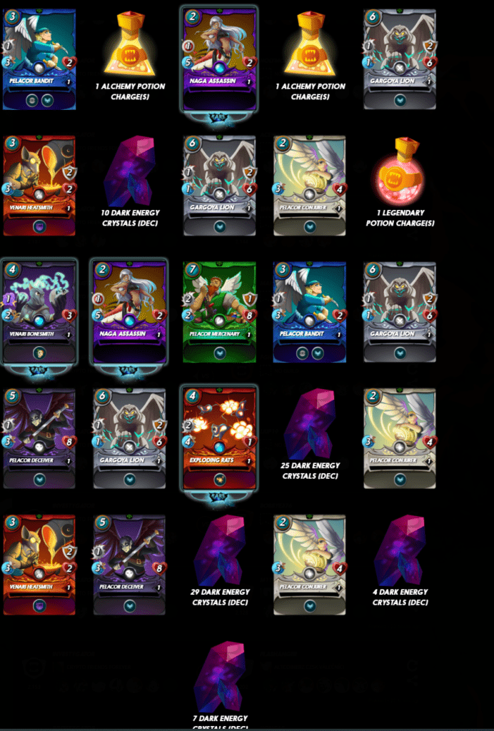 However, nothing too exciting in the pack.Daily Quest # 534. Win 5 with Dragon. For completing this daily quest, I received 1 Dark Energy Crystal (DEC), 2 Gold potions, a Pelacor Conjurer (common monster), a Pelacor Deceiver (common monster), a Pelacor Mercenary, a Gargoya Devil (rare monster), and a Gold Foil Gargoya Lion!