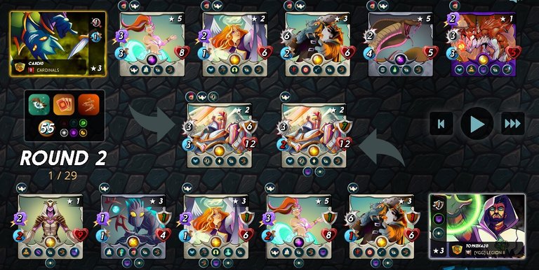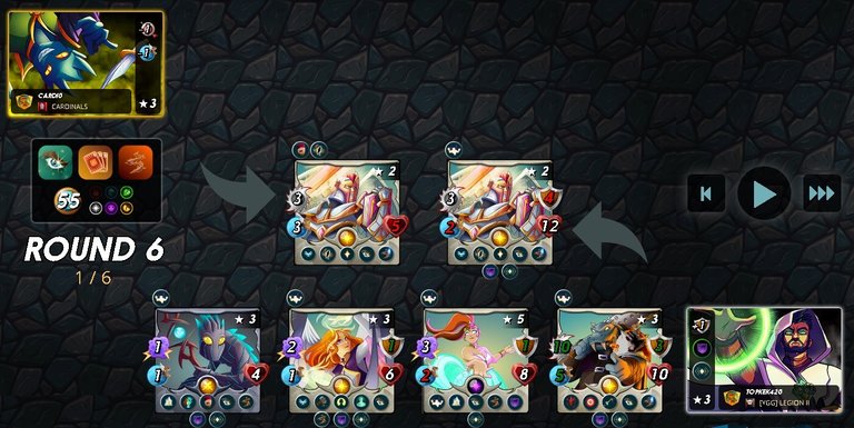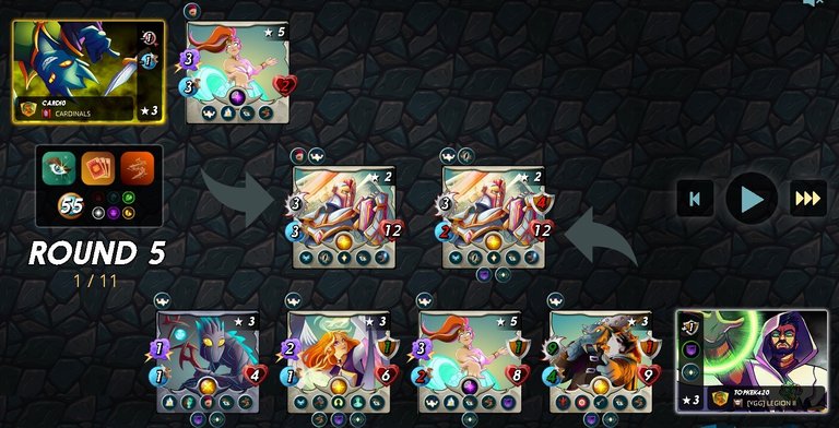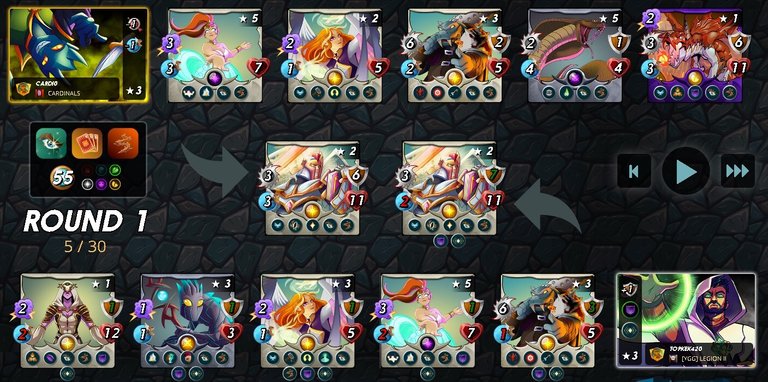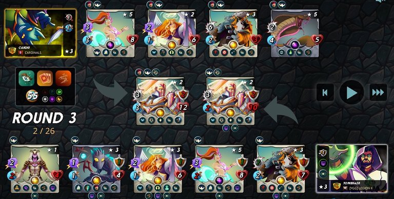 In this round not a lot of things happen. Both of the backline Taunters are taking hits for the team and getting healed by Triagers. Opponent's Uraeus takes some Thorns damage, and neither of the Jareds got the killing blows.