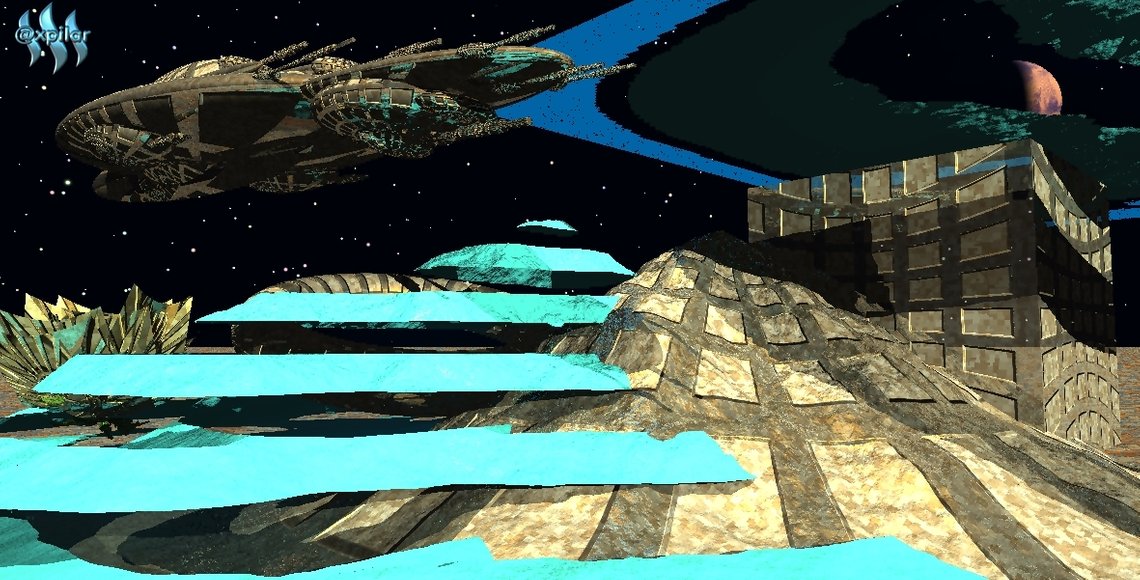 I am on another planet on the highest mountain. Below, I see a night city with lights. A spaceship will flood me to let me go down, although I can go down the interactive staircase myself. An interesting picture and imagination.